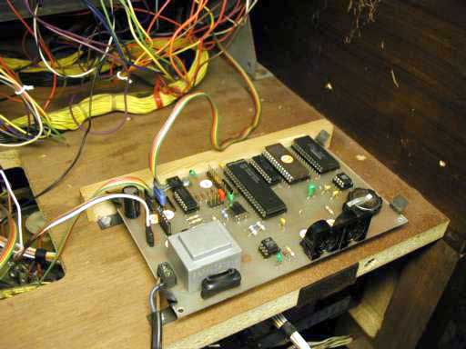 This is my T-Series MIDIvice, now under beta testing. It scans both keyboards, sending MIDI on different channels and has a simple two-button user interface. It works with a dirt-cheap 8031 and single-sided PCBs -- total cost will not exceed 40 US-$ for parts. Wiring is reduced to a minimum of 5 wires to each manual. You can choose one of 44 GM program setups by simply pressing a pushbutton and one of the manual keys. You may change the default MIDI program change sequences (256 Bytes per setup) stored in EPROM to your own needs. Best of it: You will find schematics, printed circuit layout and EPROM HEX file here -- it's freeware! Interested? First download the complete MIDIvice 1.0 schematics. MIDIvice consist of three major parts: The MIDIvice Controller Board, the Keyscan Units (you need one PCB for each 8 keys, i.e. 12 boards for a spinett organ) and a very simple "user interface" Panel.Wiring is extremely easy due to the serial 5-wire-interface to the keyscan units which fit snugly behind the key combs (see right picture above).